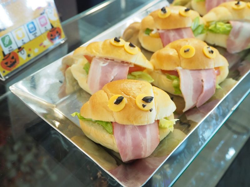 「ロールパンとベーコンのお化けサンド」ちょっとおとぼけ顔が可愛いロールパンのお化け。何個でも食べたくなる、ベーコンの舌が可愛い一品