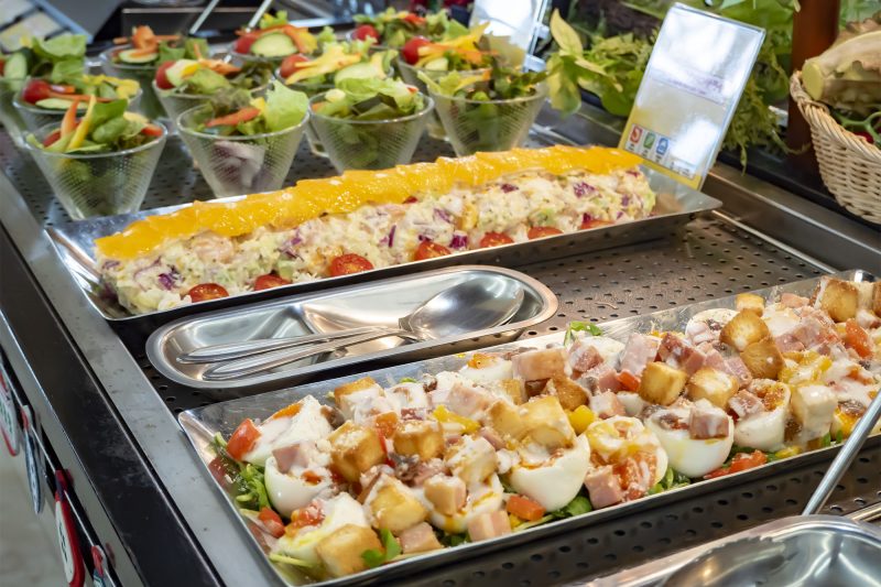 「チキンサラダ フランボワーズビネガー風味」(写真下段右)は柔らかなチキンと甘酸っぱいソースが食欲をそそります。