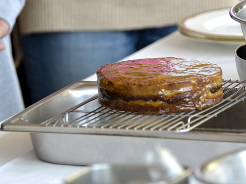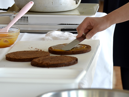 スライスしたケーキにアプリコットジャムを塗り・・・