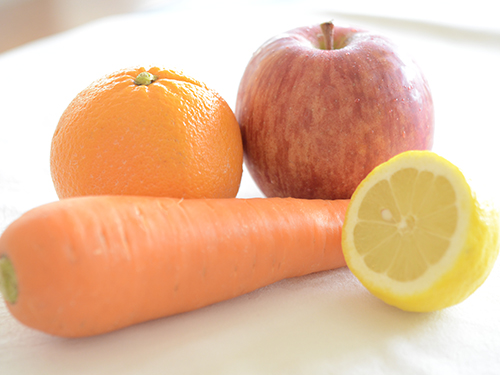 材料はこちらのオレンジ(みかん)、リンゴ、人参、レモン![]()