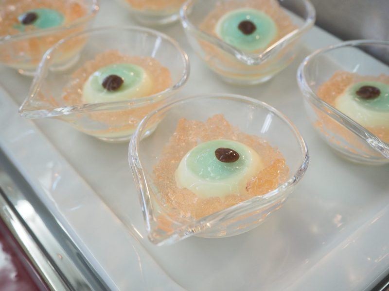 「目玉ケーキ」小さめのサイズがちょっとリアルに感じるブルーの目玉。さっぱりした甘さがリフレッシュにぴったり!