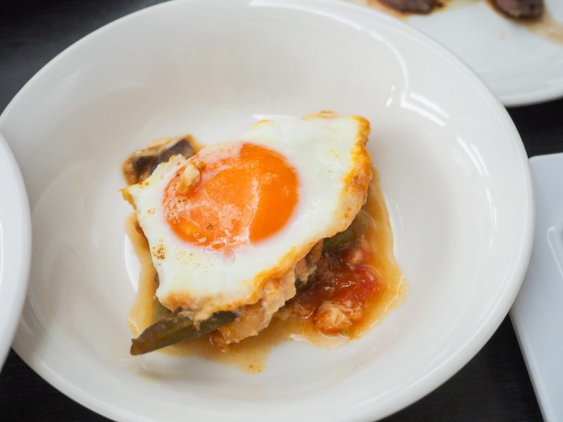 『フラメンカエッグ』はスペイン セビージャの郷土料理!たくさんの野菜とチョリソーソーセージが入っていて、上に乗った卵を合わせると、まろやかでボリュームのある一品!