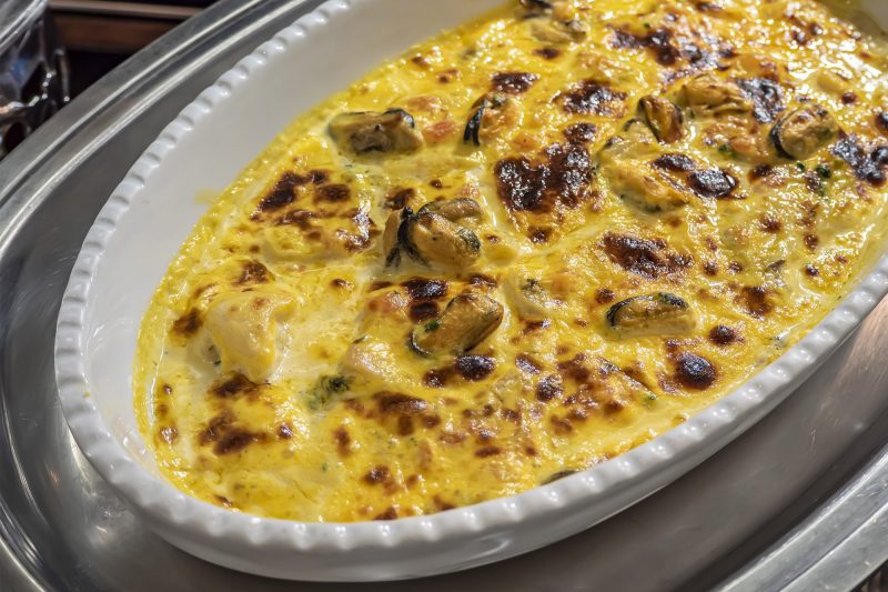「カンカル風」とは、茹でたムール貝と小エビなどをソース・ノルマンド(魚介の煮汁とクリーム、卵黄、バターで作ったソース)でつないだお料理です。