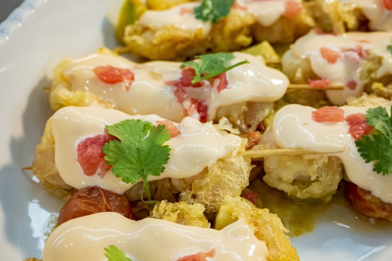 『海老串のフリットとアボカド』は、プリッとした海老をパクパク食べられるメニュー。アボカドとトマトにグレープフルーツがアクセントになっています。