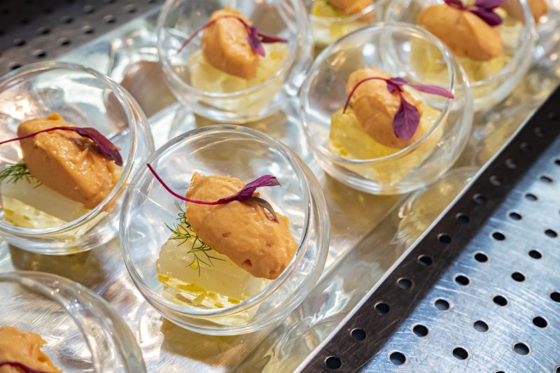 『サーモンムースとアスパラガスジュレ』は、濃厚なスモークサーモンのムースと、すっきりした透明感のあるアスパラガスのジュレのバランスが絶妙!