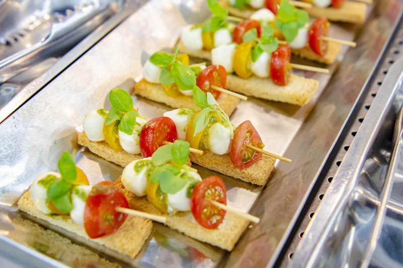 「トマトとモツァレラのピンチョス」(写真下)はバジルソースとトマト、チーズが相性抜群の組み合わせ