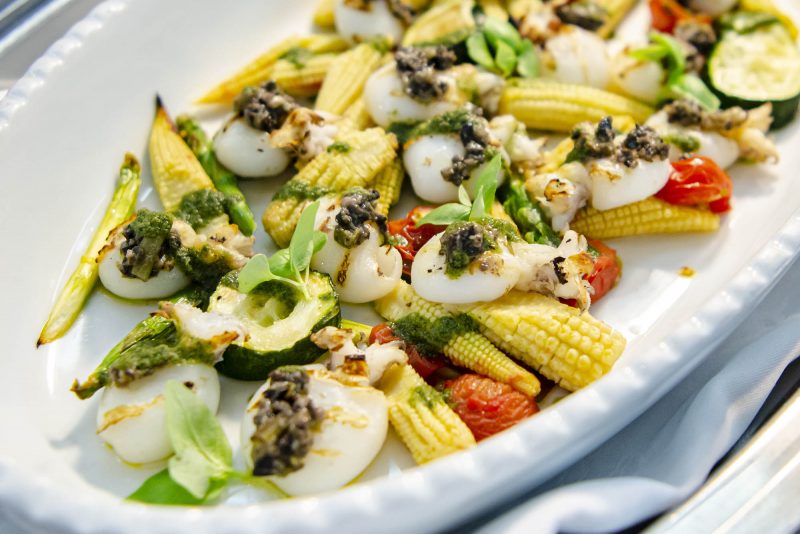「姫甲イカと彩り春野菜 黒オリーブとアンチョビ」は一口サイズの姫甲イカにバジルの香るソースがマッチした一品。