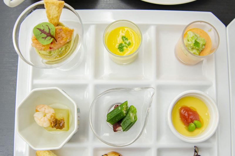 「枝豆ココット蒸し 梅肉ソース掛け」(写真下段右)は、枝豆を混ぜて茶碗蒸しのように仕立て、さっぱりした梅のソースが合わさってペロッと食べちゃいます![]()