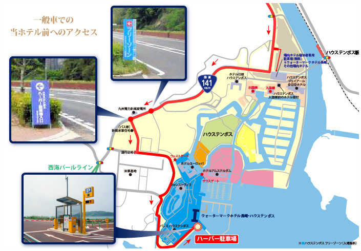 ※お車でお越しのお客様はハウステンボス入国棟前駐車場のご利用をお勧めいたします。入国棟前から発車しているシャトルバスにてホテルまでお越し下さい。